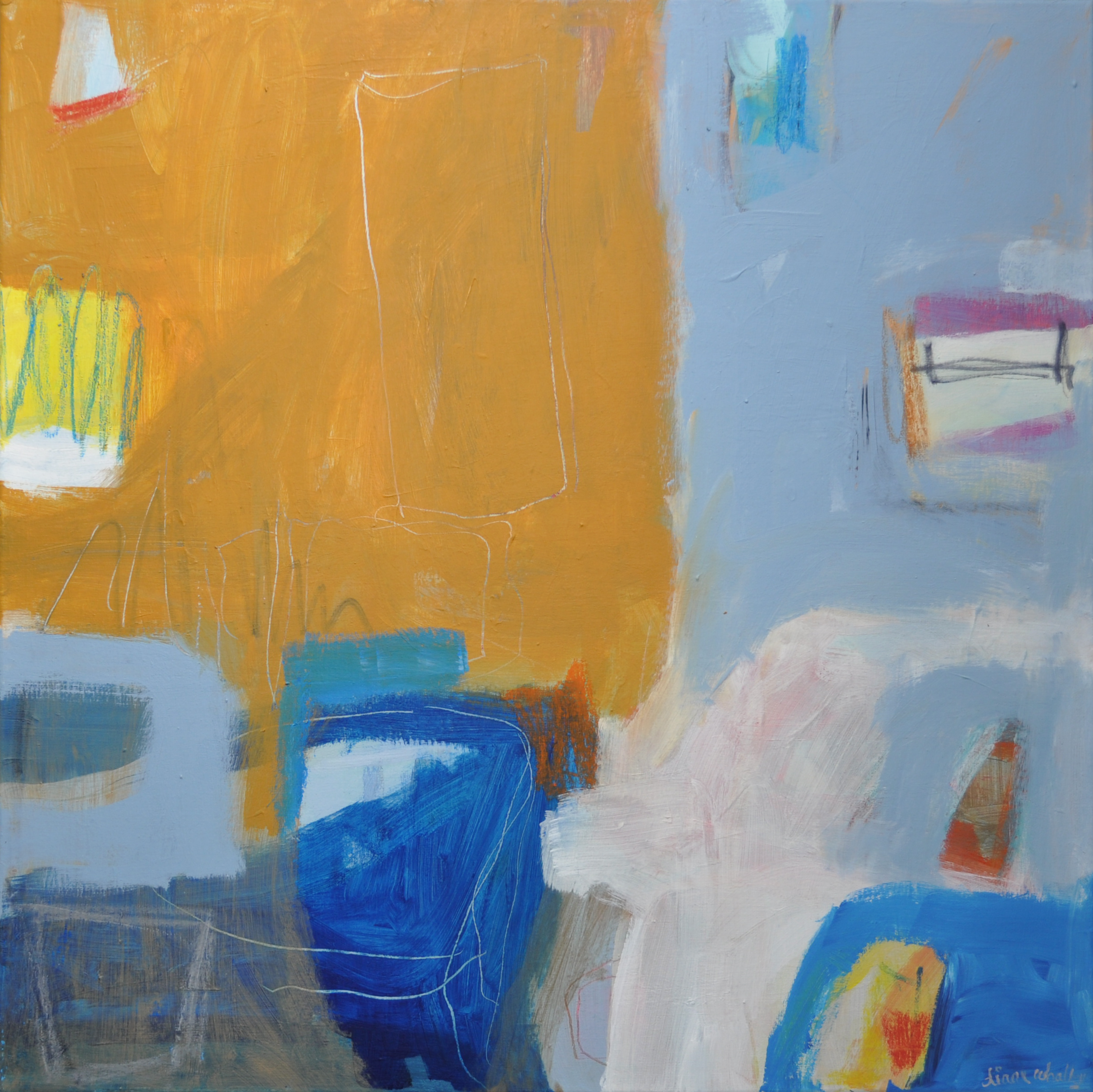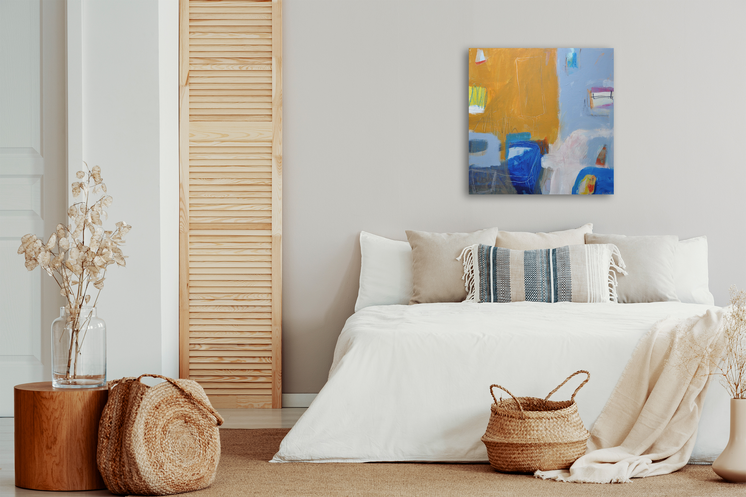 An original expressionistic abstract painting on canvas, with oil pastel and mark making detailing.