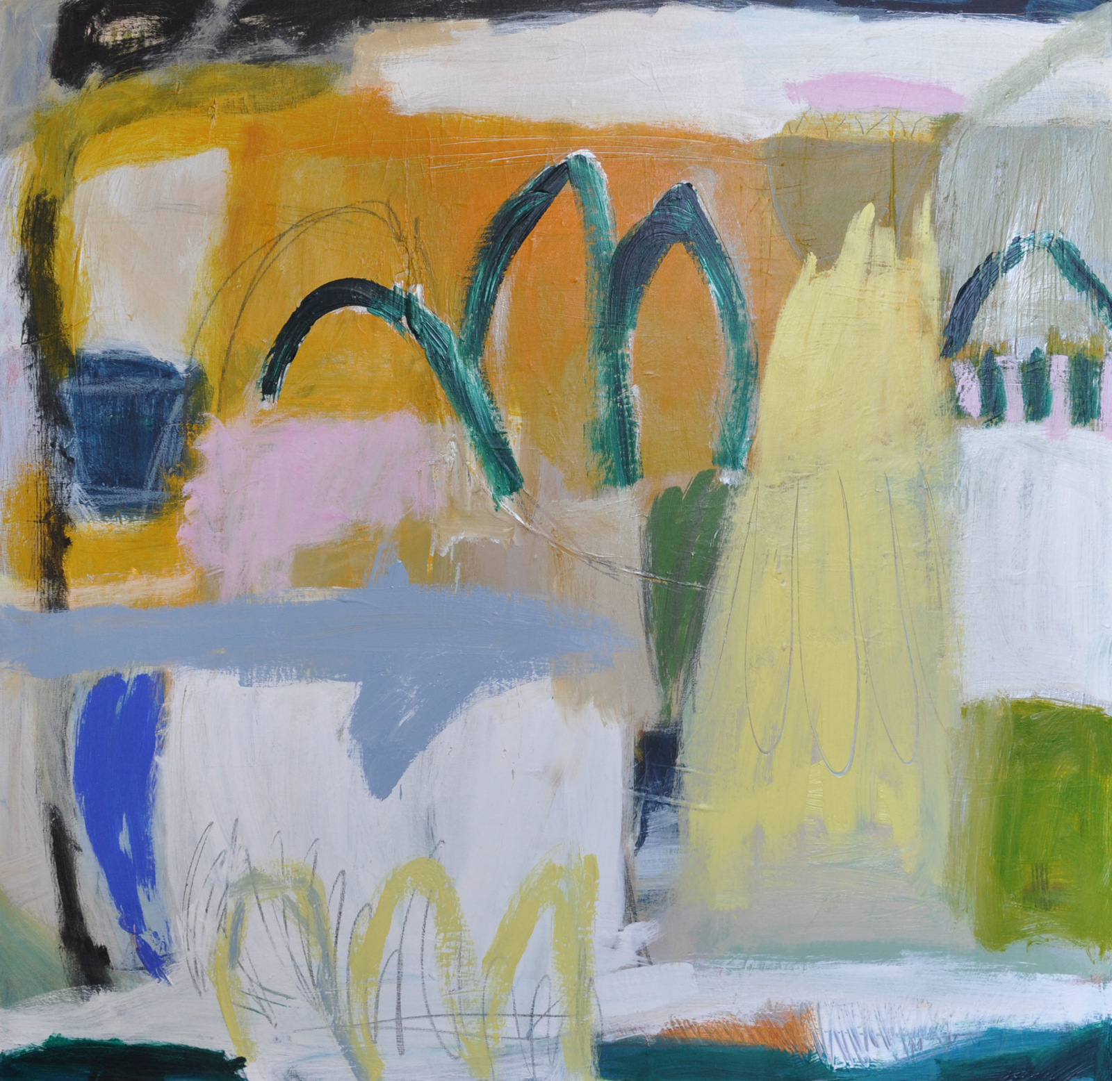 An original large abstract painting on canvas with some mark making and oil pastel details. Many layers of acrylic paint add texture, depth and intrigue.