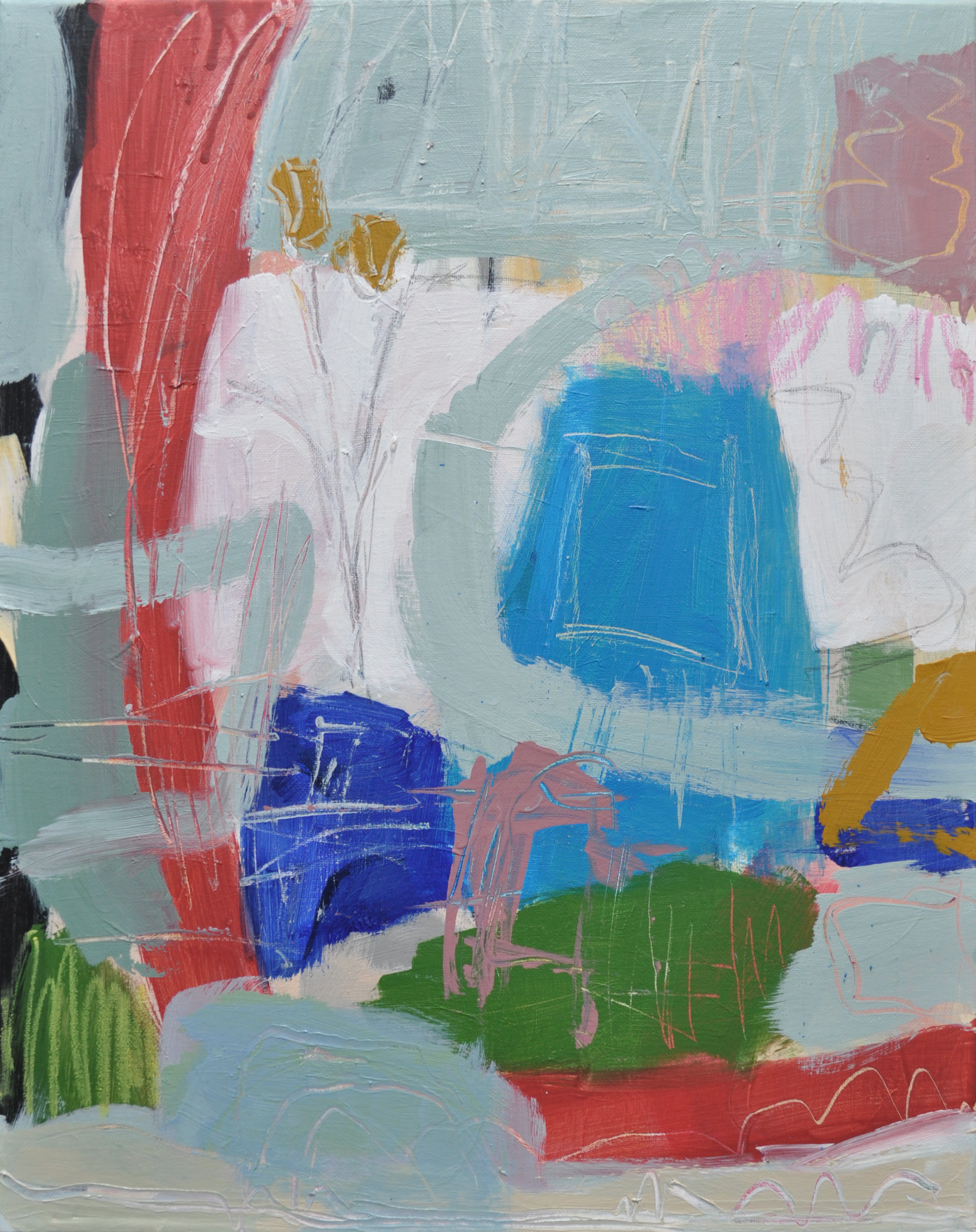 This artwork began life as an abstract but the addition of the yellow paint inspired an evolution into an abstract still life. On standing back to review the piece, the yellow popped out as abstract flowers in a vase on a windowsill, the red was draping like a curtain and, through the abstraction, is glimpsed the bay. It is a dream-like piece, where you look beyond the immediate environment and watch in wonder all that can be seen along the coast and beyond. Travel and life by the coast were the starting point for this contemporary artwork.
